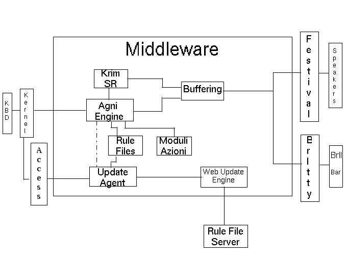 Nella figura 1, con la dicitura "kernel", si è inteso il key handler che dal kernel passa a Middleware i tasti premuti dall'utente. Access gestisce il caricamento in modo "accessibile" dei vari servizi. Per questo passa a Middleware le informazioni sull'applicazione, che si occuperà di caricare i Rule File corrispondenti all'applicazione stessa. Nel caso in cui non sia presente nel sistema alcun Rule File per il servizio desiderato, Middleware contatta via web un Repository (Rule File Server). Nel caso di risposta positiva dal Repository, il Rule File viene scaricato in locale ed aggiunto a quelli già presenti nel sistema.